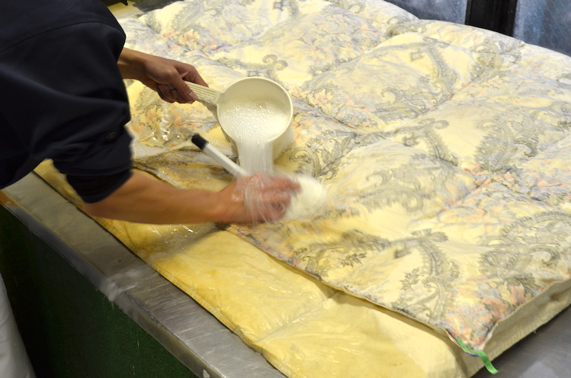 デアでは、羽毛・綿・羊毛など素材に合わせた洗浄を行い、たっぷりの水と天然石けんで丸洗い。